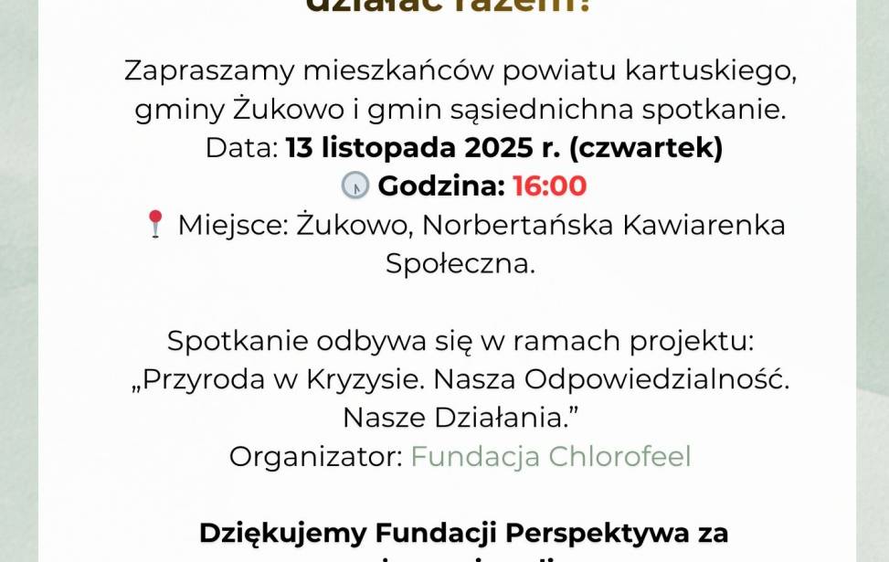 Zapraszamy na spotkanie z mieszkańcami, któe zaplanowaliśmy w Społecznej Kawiarence Norbertańskiej w Żukowie. "Społeczność dla klimatu - Jak działać razem?"